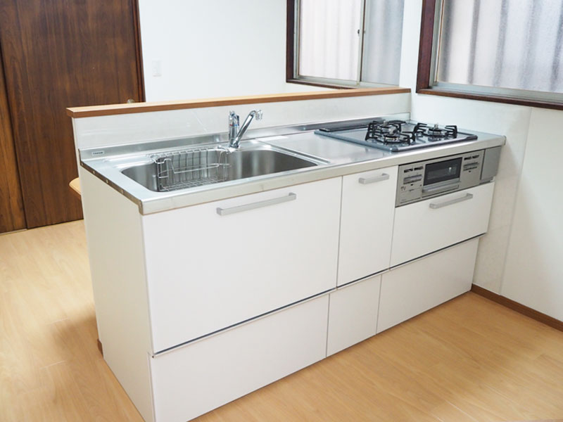 キッチン:クリナップ ラクエラ(扉カラー:トーンホワイト) キッチンカウンター:ダイケン メラミン L1800 床材:サンゲツ フロアタイル WD-765 天井・壁クロス:サンゲツ クロスSP級 勝手口ドア:YKKap ドアリモ 通風タイプ |